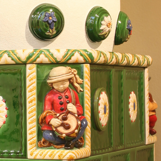 Als Mitgabe - Mitgift - für junge Brautleute zur Gründung eines eigenen Hausstands war ein Kachelofen Sinnbild für Solidität und Geborgenheit, ein Zeichen von Wohlstand und Aufstieg, weitergereicht von Generation zu Generation. Heute steht der Hochzeitsofen einfach für Beständigkeit und zeitlose Ästhetik. Entworfen hat dieses außergewöhnliche Stück bester Handwerksarbeit der österreichische Jugendstilkünstler Michael Powolny, Mitbegründer der Wiener Sezession, Initiator und Miteigentümer der Wiener Keramik. Heute noch werden die Originalkacheln nach seinen Entwürfen mit den alten Modeln hergestellt - wie vor hundert Jahren.