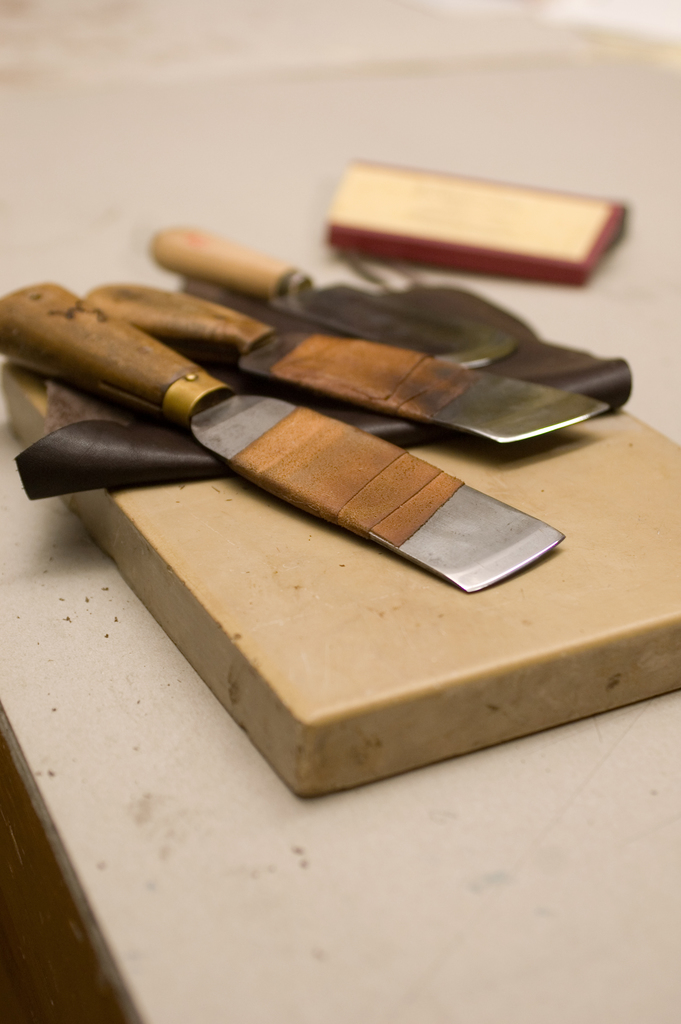 Walter Gstettenhofer beherrscht noch die Kunst der Fadenheftens, bei der das Papier ohne Verklebung mit echtem Leinenzwirn Blatt für Blatt mit dem Geweberücken vernäht wird. Der Einband besteht oft aus säurefrei gegerbtem Leder, das das Papier auch nach Jahrzehnten nicht angreift, und wird erst zuletzt mit dem Papierblock vereint. Dies macht aufwändige Bearbeitungsschritte am Einband möglich – wie etwa Letterprägungen, Vergoldungen und die Einarbeitung von Holz, Metall und Glas.