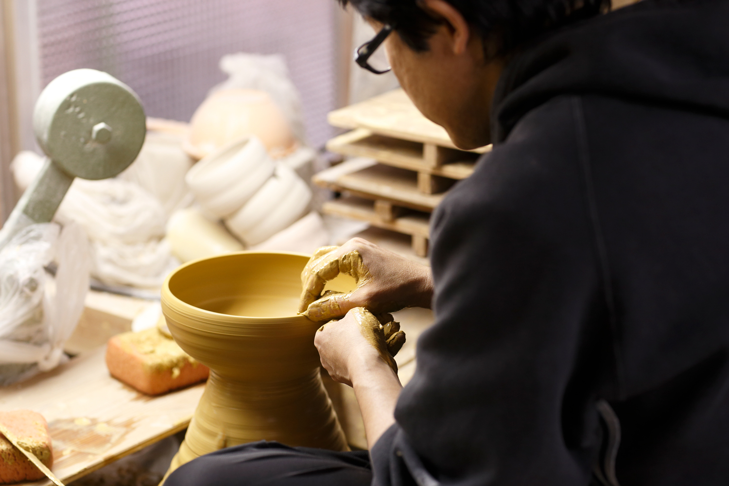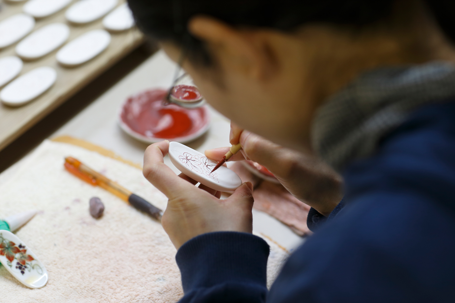 Mr Takayoshi Kumagai is the company's third generation successor, As a wholesaler, he plays a role similar to that of a producer. In Kyoto, the pottery industry has developed division of labour with craftsmen specializing in various roles such as clay modeling, pottery body making, painting, and gold leaf application, and they relay their work to create products. This is where wholesale dealers like Kumagai Shoten come in, planning products and allocating orders based on the appropriate style and kiln according to their expertise.