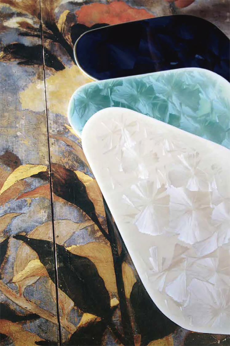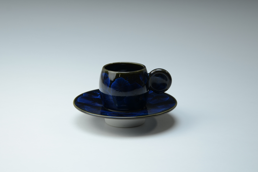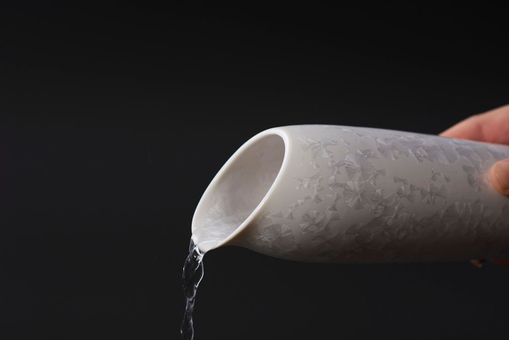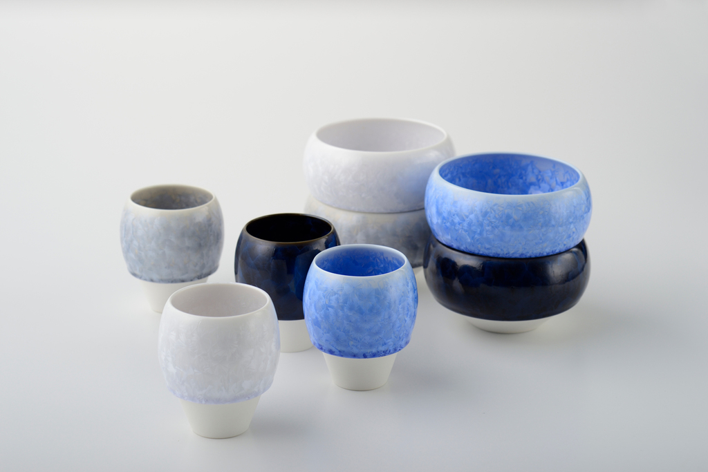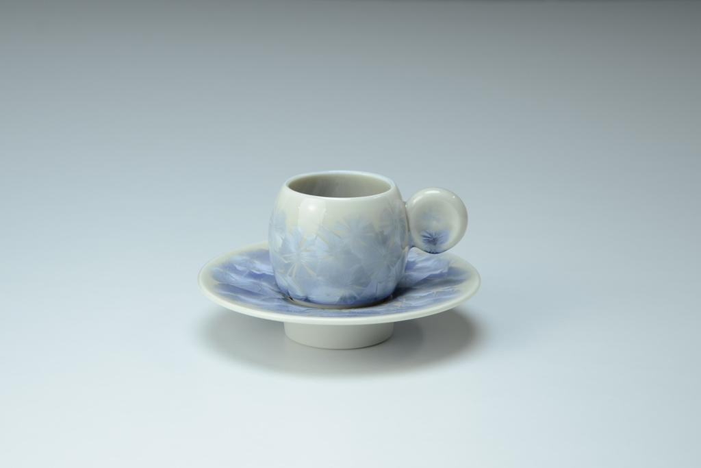 In 2012, advisors from France visited the Kumagai Shoten showroom. What caught their attention was a technique called "Zinc Crystal," featuring patterns that resemble delicate flower petals.This technique involves a glaze containing a metallic component called zinc oxide, which blooms like a snow crystal with the temperature changes inside the kiln. Achieving this beautiful crystalline pattern requires very precise temperature control, making it unsuitable for mass production. The Flower Crystal design made a significant leap forward due to the collaboration with designer Kashige Miyake who introduced demitasse cups and bowls designed to be stackable. Mr. Kumagai continues to actively collaborate with designers in product development. One of the recent products is the modern incense burner "Kino Kaori" that also makes use of the flower crystallization.