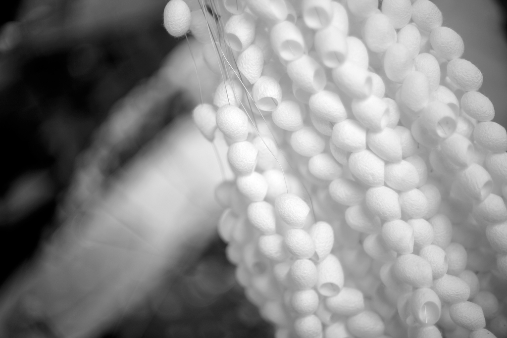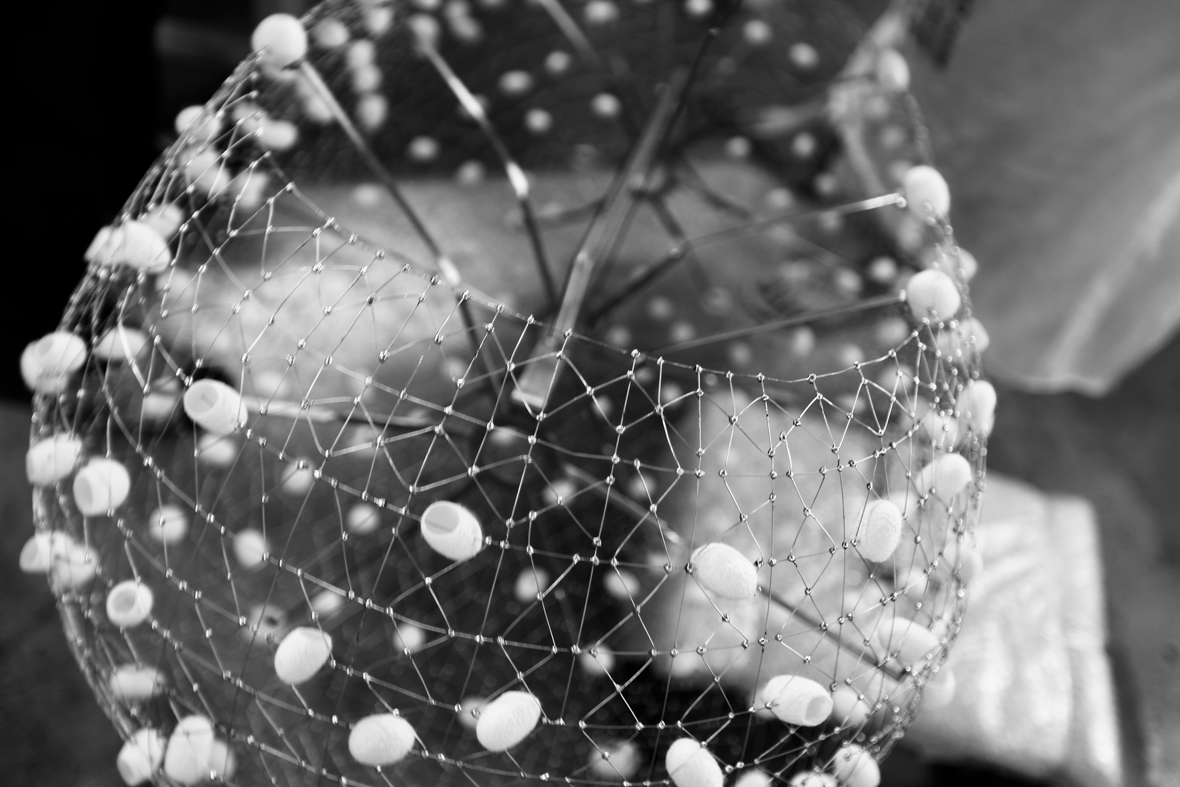 In Paradise, we build up a hand welded steel structure (each with approximately 2100 different joints) over a core base and this creates the underlying form of the design. Then around 2600 individual silk cocoons are attached to the base structure in a random composition. Each cocoon has an aura of ultra fine transparent silk fibre around it which subtly refracts and diffuses the light. Whatever space Paradise is installed in, has a dusting the magic vibe of natural creation taken and fabricated further into something else.