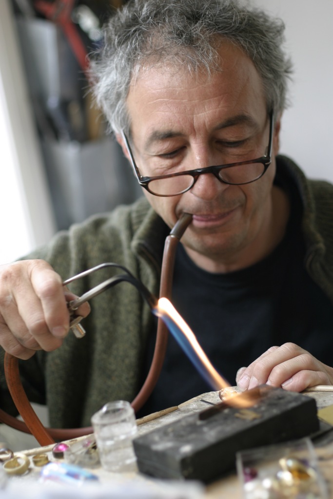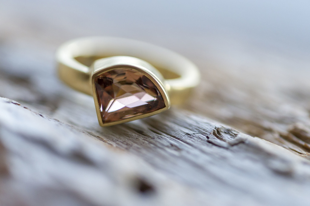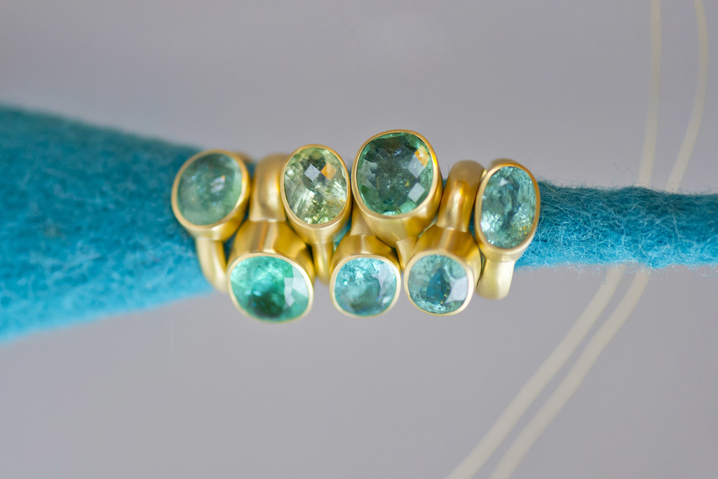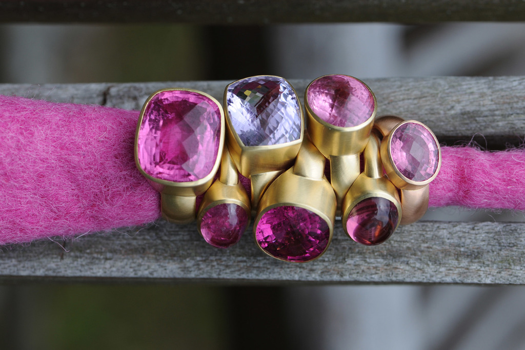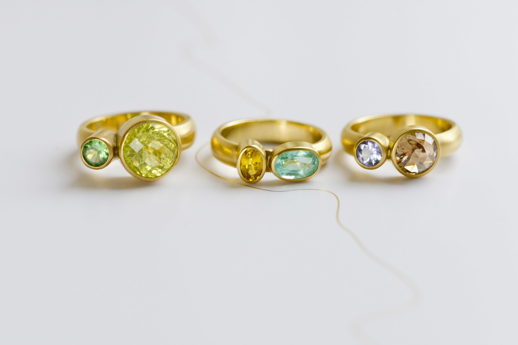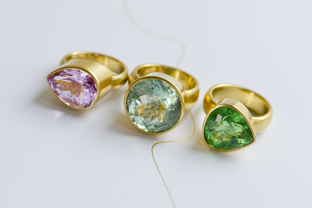 Es ist die Balance zwischen der schlichten Eleganz seiner Entwürfe, der üppigen Farbigkeit der sorgfältig ausgewählten Steine und deren Brillanz, die seinen Schmuck so einzigartig machen. Der Goldschmied Christoph Freier bevorzugt Harlekin- und Cabochonschliffe, beide Schliffarten fühlen sich wunderbar weich an. Sein liebster Werkstoff bleibt aber Gold, da es eine besondere Wärme ausstrahlt. Es entstehen Ringe mit einer ungeahnten Farbvielfalt von Edelsteinen, die zum Mittelpunkt am Finger werden, während Fassung und Ringschiene ganz zurücktreten.