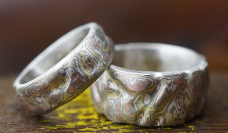 Mokume Gane heißt übersetzt „holzmaseriertes Metall“ und ist eine alte japanische Metallverarbeitungstechnik, verwandt mit Damast.