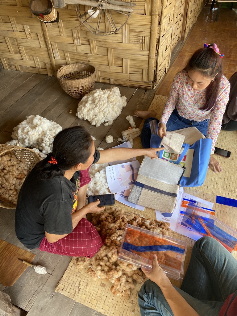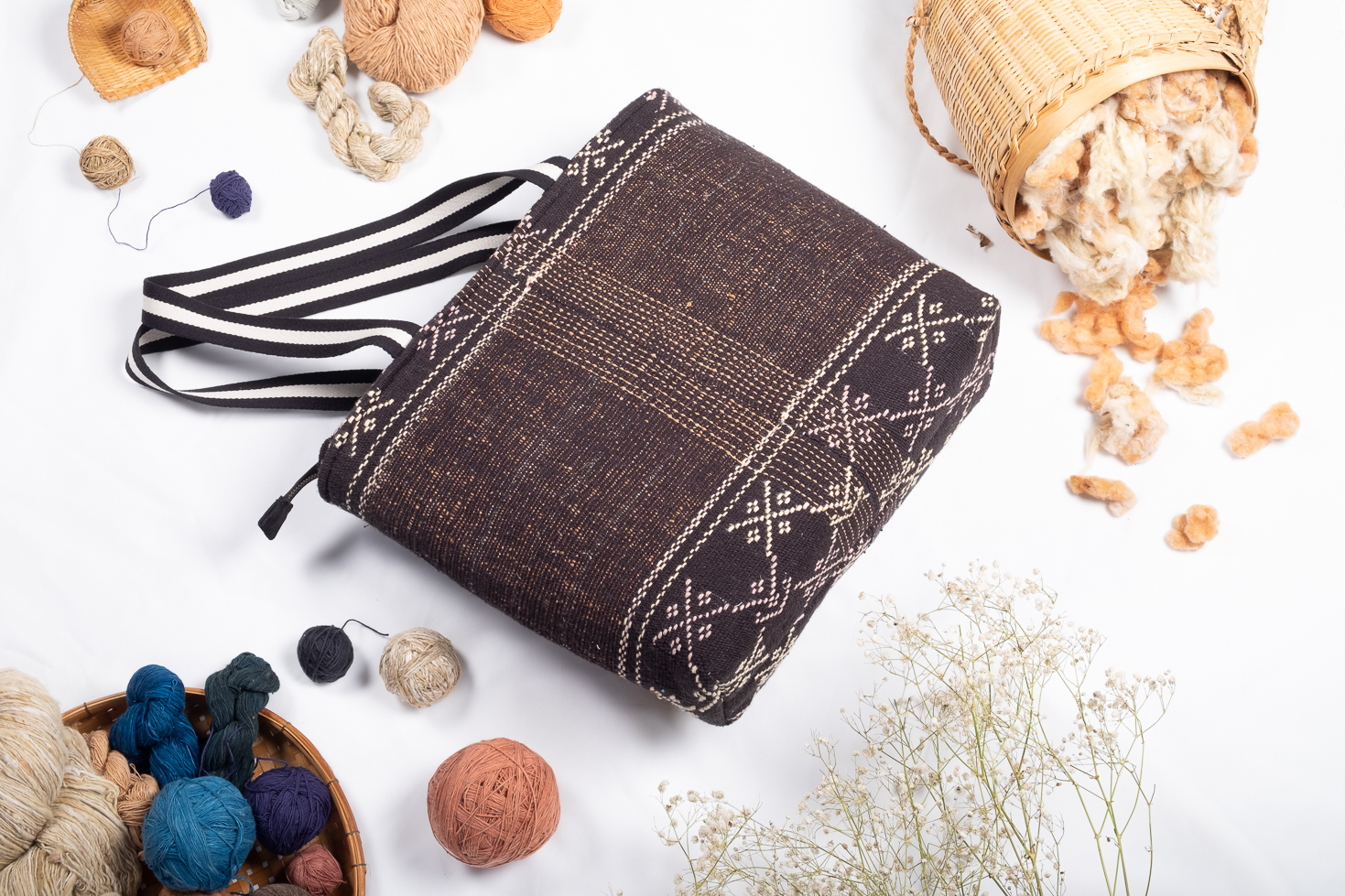 This collection was inspired by conversations with the elders in the community. A smiling face shows the joy of the storyteller that are relaying stories from the past to us. Then, we picked up the traditional Karen flower weaving pattern as a reminder of happiness with a sweet memory and conveyed on the woven fabric pattern used to make this collection bag, such as: