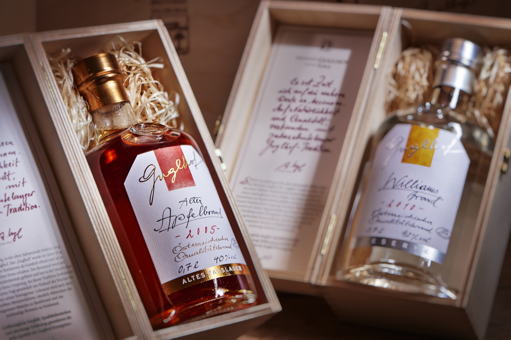 Bereits seit Generationen verschreibt sich die älteste Brennerei aus dem Land Salzburg den Erzeugnissen von Edelbränden. Wacholder und verschiedene Wildfrüchte wurden am Guglhof für die Herstellung von Gin bereits in den 30-er Jahren verwendet. 2010 wurde die alte Rezeptur wiederentdeckt und in vielen weiteren Schritten immer weiter verfeinert. Alpenrosenblüten, Bergminze, Zitronenmelisse, Holunderblüten und so manch andere Zutat geben dem GIN Alpin von heute seine ganz besondere und außergewöhnliche Note. Die Guglhof Jahrgangsbrände Rote Williams, Marille, Alte Zwetschke und auch Vogelbeere etc. überzeugen durch ihre klare, typische und intensive Fruchtnote. Wichtig hierfür ist unter anderem die Reife der Brände. So muss sich Anton Vogl oftmals in Geduld üben, um Jahre abzuwarten, bis seine Destillate in die markanten Guglhof Flaschen gefüllt werden können.