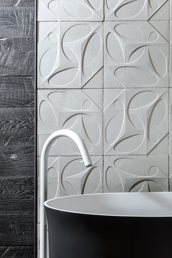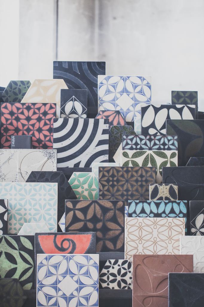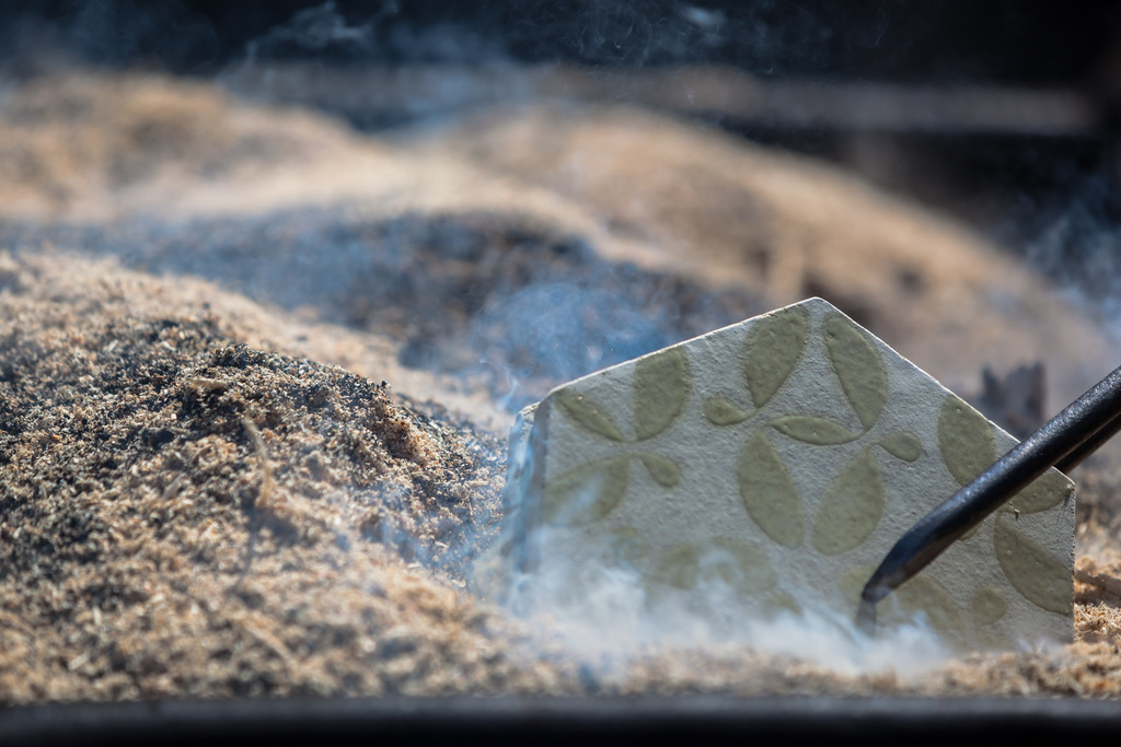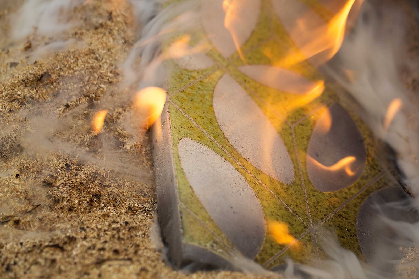 Following the 700-year-old Japanese Raku technique, Karak tile manufacture is reviving a dying sort of craftsmanship in its most complex form: when fired, each tile is removed from the furnace at a temperature of 800 to 900°C, covered in sawdust and then submerged in cold water. It is the strongly operating elementary forces that create the tiles’ unique character.