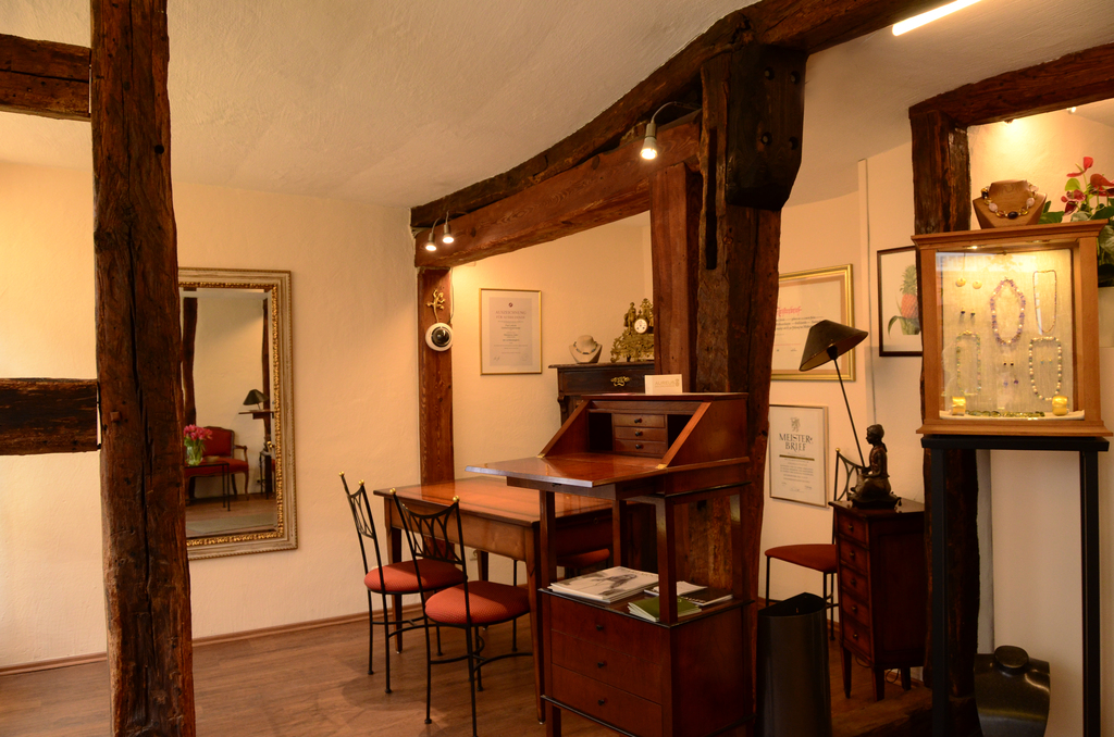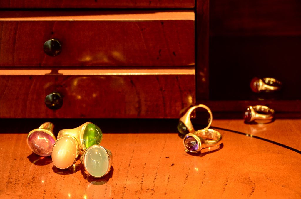 Individuelle Schmuckstücke entstehen in einem längeren Prozess des Austausches und der Abstimmung mit den Kunden. Eine breite Palette farbiger Edelsteine in unterschiedlichen Schliffen, Formen und Größen stehen zur Auswahl, dazu Vorschläge und Modelle zu deren Verarbeitung. Inspirationen liefert auch die kleine aber feine AUREUS Kollektion mit hinreissenden Beispielen handgefertigter Preziosen. Verarbeitet wird 750er Gold aus eigenem Recycling, Schmuck den Kunden umarbeiten oder neu gestalten lassen. Für die Entscheidung zu klassischen Schmuckformen spricht ihre zeitlose Eleganz, deren gestalterische wie handwerklicher Perfektion über Jahrzehnte Bestand hat - in einem wohl proportionierte Schmuckstück von angemessenem Gewicht, dessen makellose Steine ihre optimale Entsprechung in einer präzisen Fassung finden.