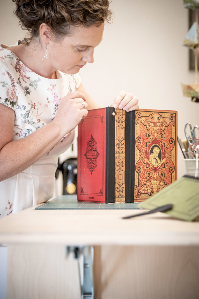 Die ausgefallenen Taschen werden im historischen Ambiente eines Altstadthauses im Steyrer Wehrgraben von Bernadette Hartl händisch erzeugt. In der Werkstatt, welche gleichzeitig Schau- und Verkaufsraum ist, wird nach jahrhundertlanger Handwerkstradition nun eine alte Singer Schusternähmaschine (Bj 1916) mit Fußantrieb etwas anders betätigt - nämlich um auf Büchern zu nähen. Alte Bücher dürfen ihre Geschichte in anderer Form weiterleben.