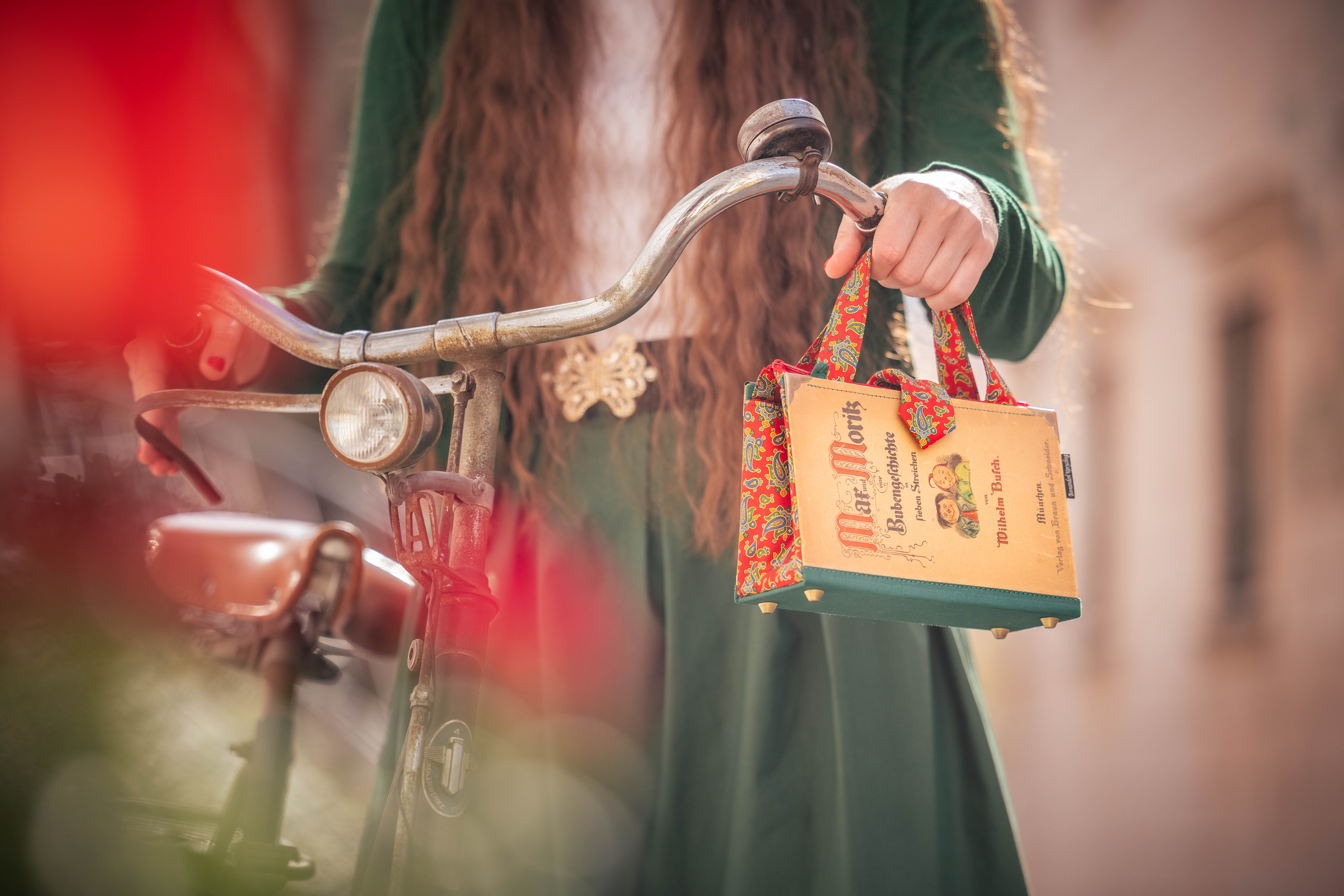 Schmucke Bucheinbände kombiniert mit Krawatten werden in ausgefallene Taschen für jeden Typ oder Anlass verzaubert – ob Abendtasche, Shopper oder Aktentasche. Bernanderl Upcycling schafft aus Altem Trendiges, lässt Verblichenes glänzen und setzt Designs völlig neu in Szene.